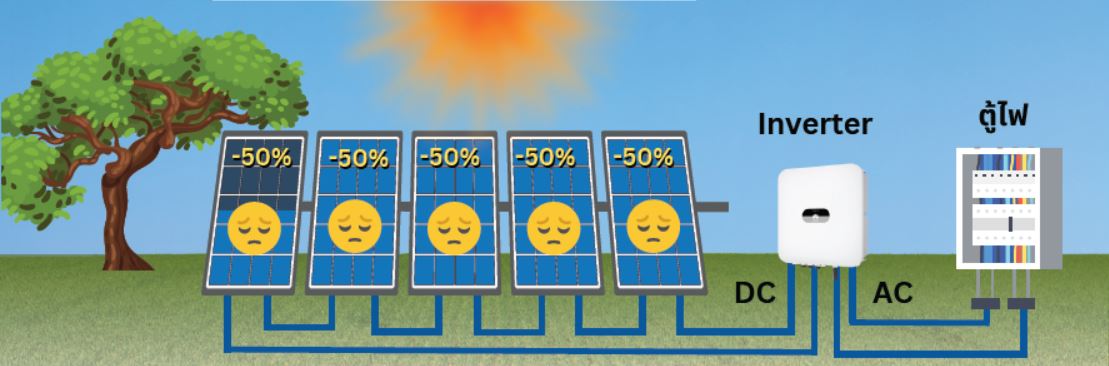 สตริงอินเวอร์เตอร์ : เมื่อแผงใดแผงหนึ่งในกลุ่มสตริงโดนเงาบังจากสิ่งแวดล้อมรอบข้าง ทำให้พลังงานของแผงโซล่าเซลล์แผงอื่นๆที่ต่อร่วมกันลดลงไปเท่ากับแผงที่ให้พลังงานต่ำสุด