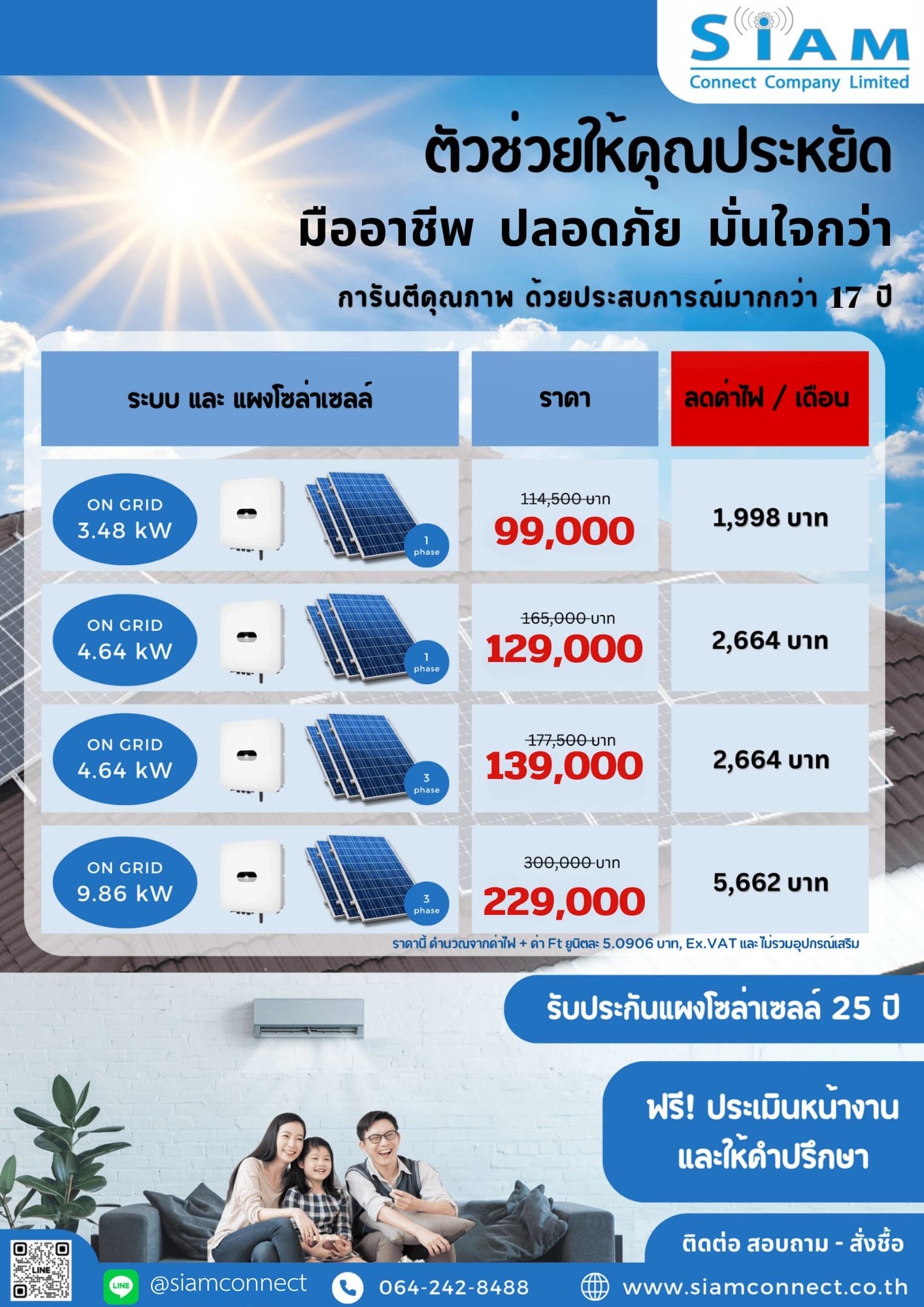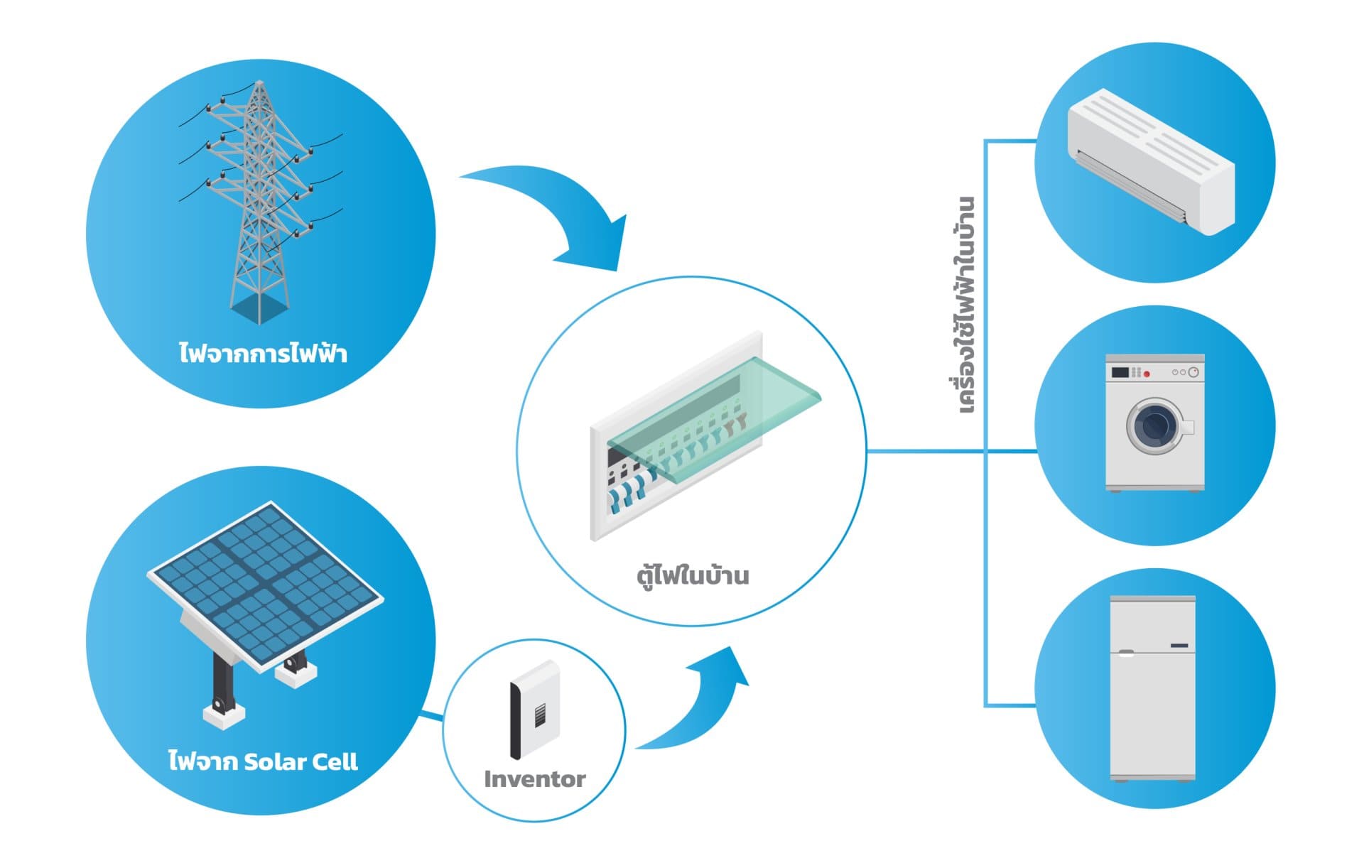 ระบบที่ง่ายที่สุด และถูกที่สุดของ Solar Rooftop สำหรับบ้านพักอาศัย คือการผลิตไฟฟ้าในช่วงกลางวันและใช้ทันที ไม่เก็บสำรองในตอนกลางคืนโดยต่อร่วมกับระบบไฟฟ้าของการไฟฟ้าเรียกว่า "ระบบOn-Grid"