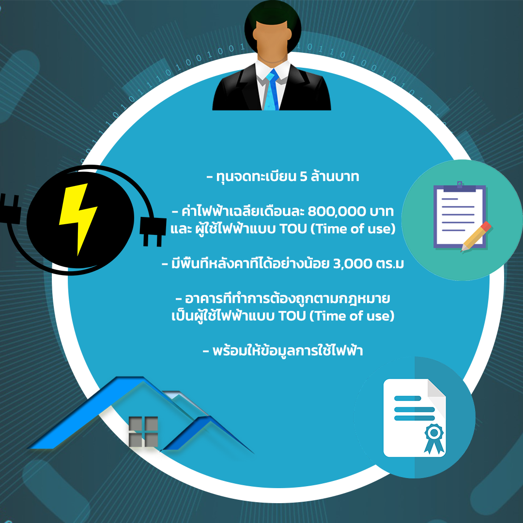 - มีค่าไฟฟ้าต่อเดือนเฉลี่ย ไม่ต่ำกว่า เดือนละ 800,000 บาท และ เป็นผู้ใช้ไฟฟ้าแบบ TOU (Time of use)